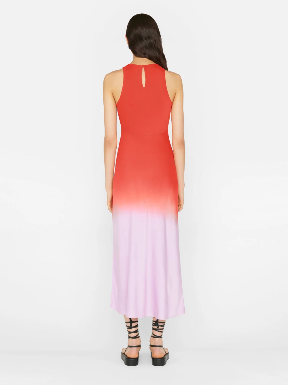 Hand-dyed in vibrant hues for an understated take on tie dye, each 100% silk midi dress in this tonal red orange and lilac colorway is unique. This dress is bias cut for a flattering fit, and features a tank-style neckline with a button closure at the nape of the neck.