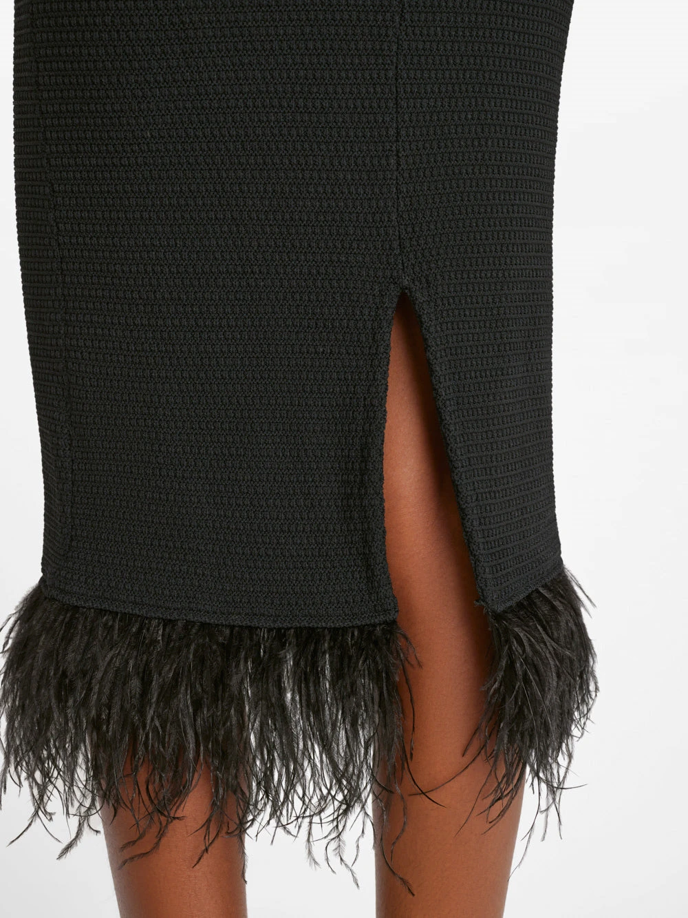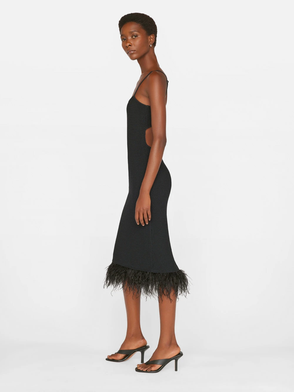 With a curve-accentuating silhouette done in tight-weave crochet, this midi elevates the LBD to statement-piece status. Slinky adjustable straps, a side slit, and an alluring cutout detail at the back balance the playful, on-trend responsibly sourced ostrich feathers along the bottom hem for a look you can dress up or down year-round.