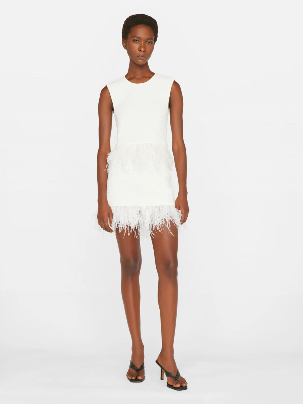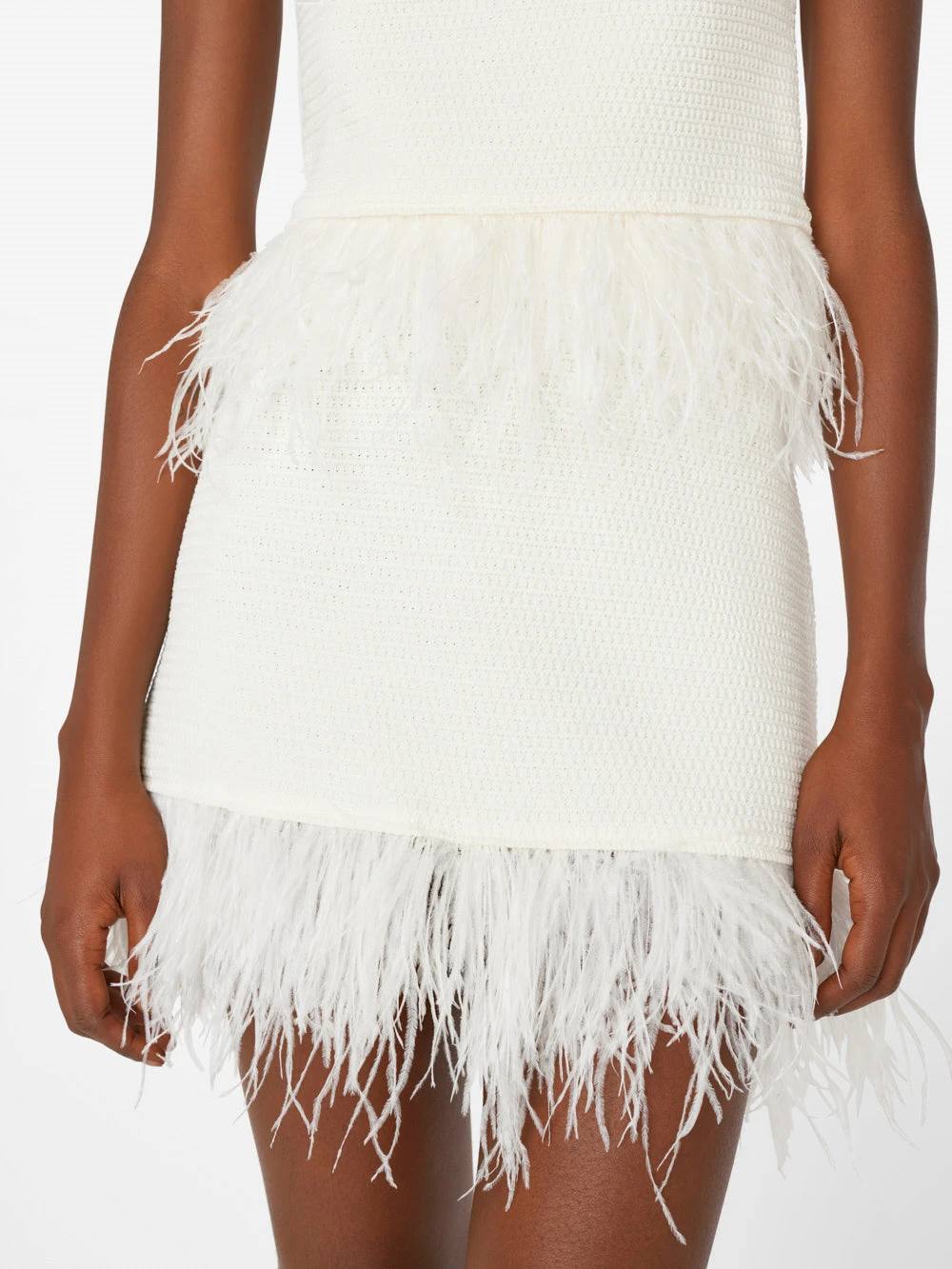 Done in a tight-weave crochet and finished with a sweep of responsibly sourced ostrich feathers at the hem, this miniskirt pairs with the matching tank to create a chic set perfect for adventures abroad, summer nights out, and sunset dinner dates.