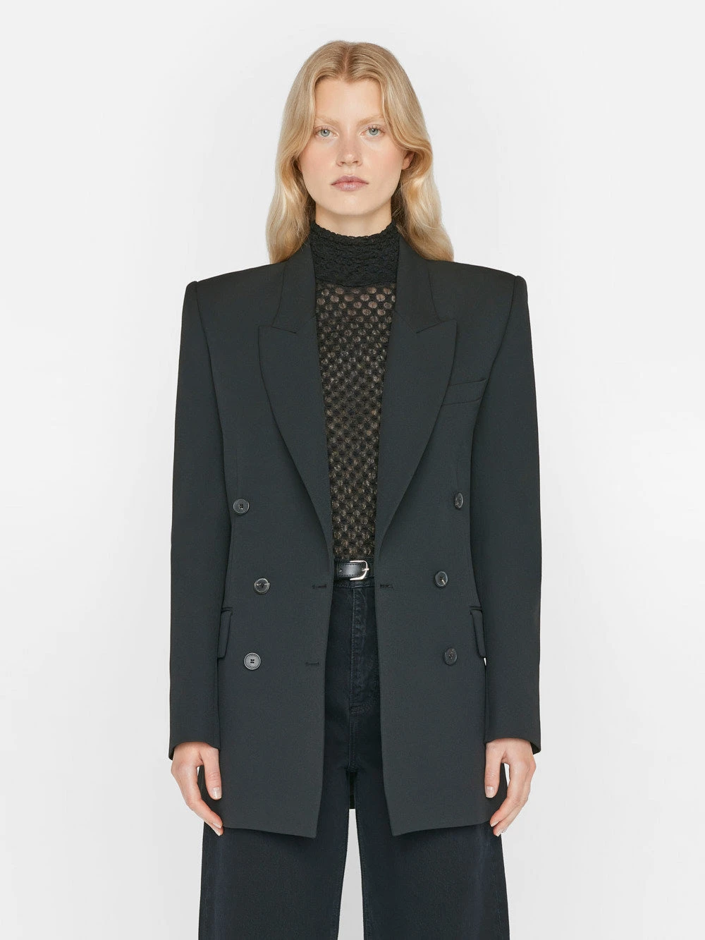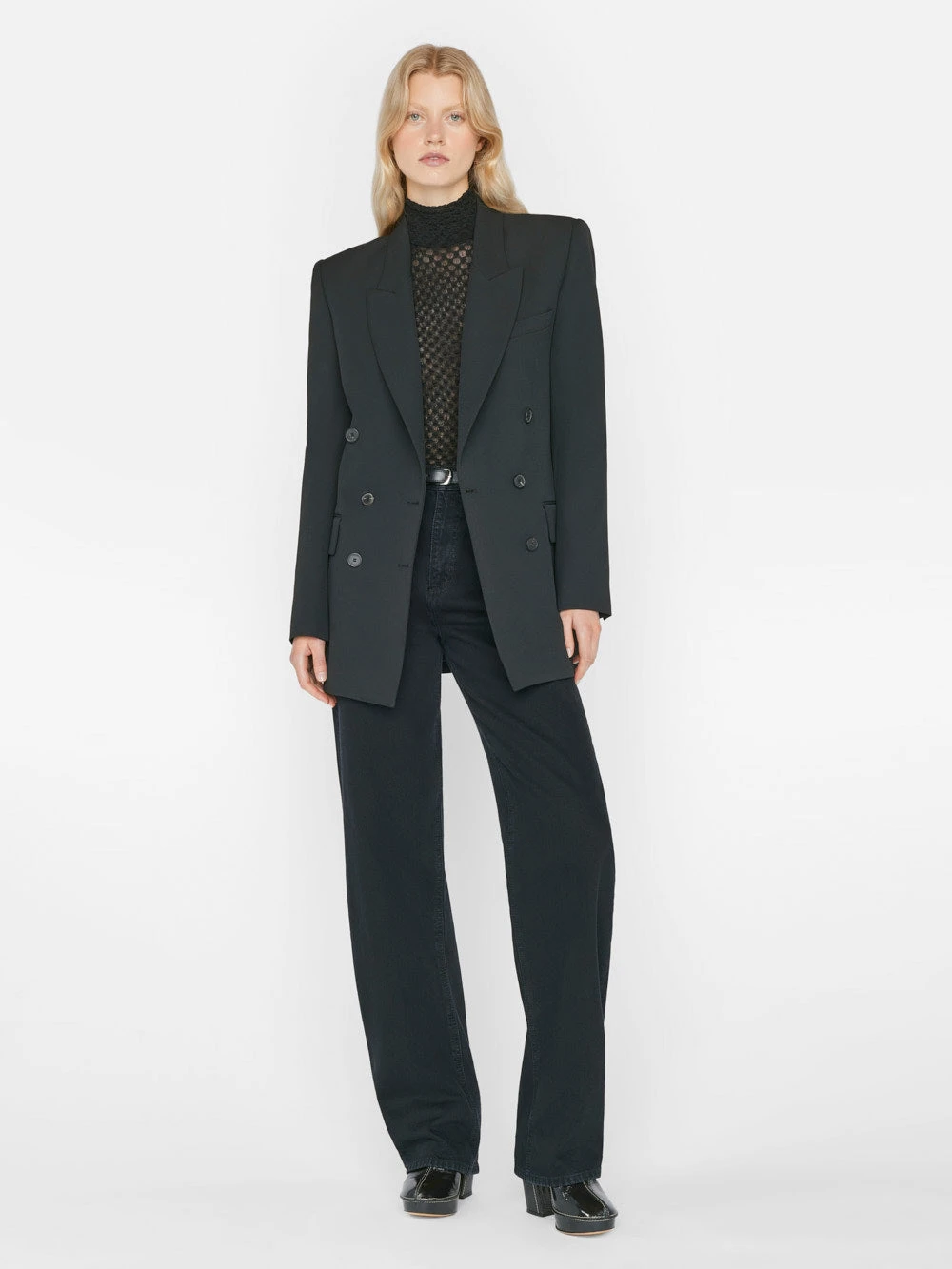 SKU: ZNJHB 7348239794352 Categories: Clothing & Accessories, Jackets & Coats, Women Tags: _badge:july23_exclusions_sitewide, _badge:waitlist, Clr-dscrp::NOIR, Collection::jackets & coats, Collection::new women, Collection::women, Collection::womenclothing, Color-code::NOIR, Delivery::F23_D2, Filter-color::Black, Filter-sleeve::BLAZER, Filter-style::NA, Fit:true, FLOW_INTL, FLOW_US, InventoryClassification::F23, Non-exclusion, Non-Sale, Season::F23, Style-code::F23HBZ03, Styled::extra-long-barrel-film-noir, Styled::mesh-lace-turtleneck-noir, Swatch:Double Breasted Slim Blazer, Waitlist
