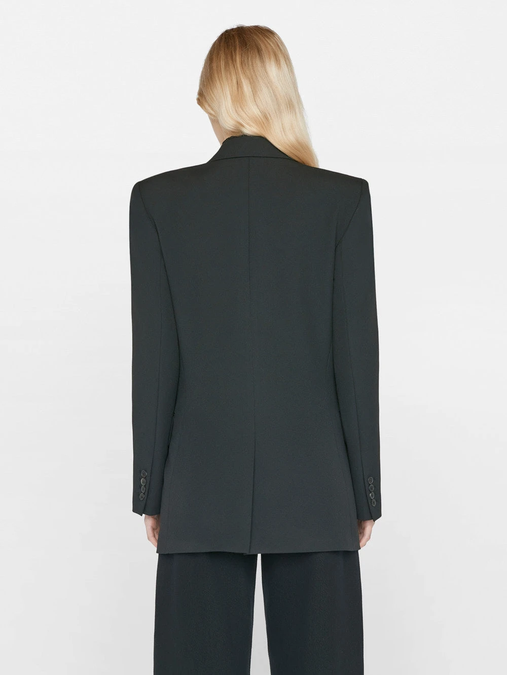 A menswear-inspired, double-breasted, four-button blazer featuring a feminine fit that darts in at the waist, functional oversized pockets, and a beautiful neckline that offers clean, modern lines. Crafted from a sophisticated suiting fabric that lends an airy drape to any silhouette.