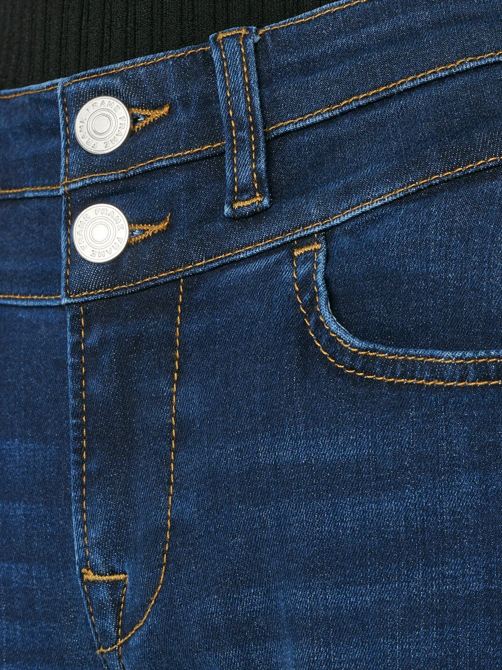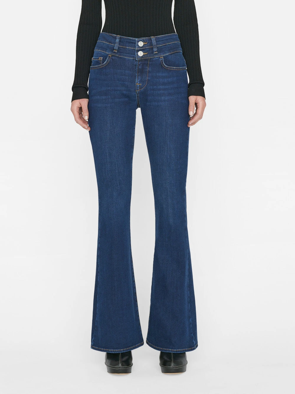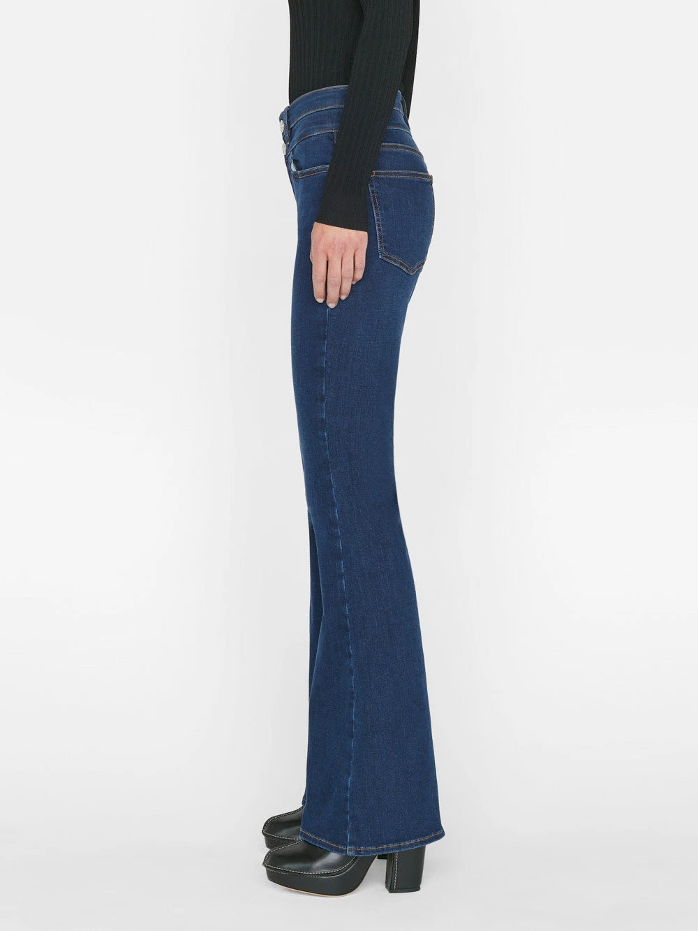A FRAME signature jean with double waistband detailing, form-fitting silhouette through the leg, and generous flare from the knee. Crafted from a sustainable stretch cotton blend with the softest hand.