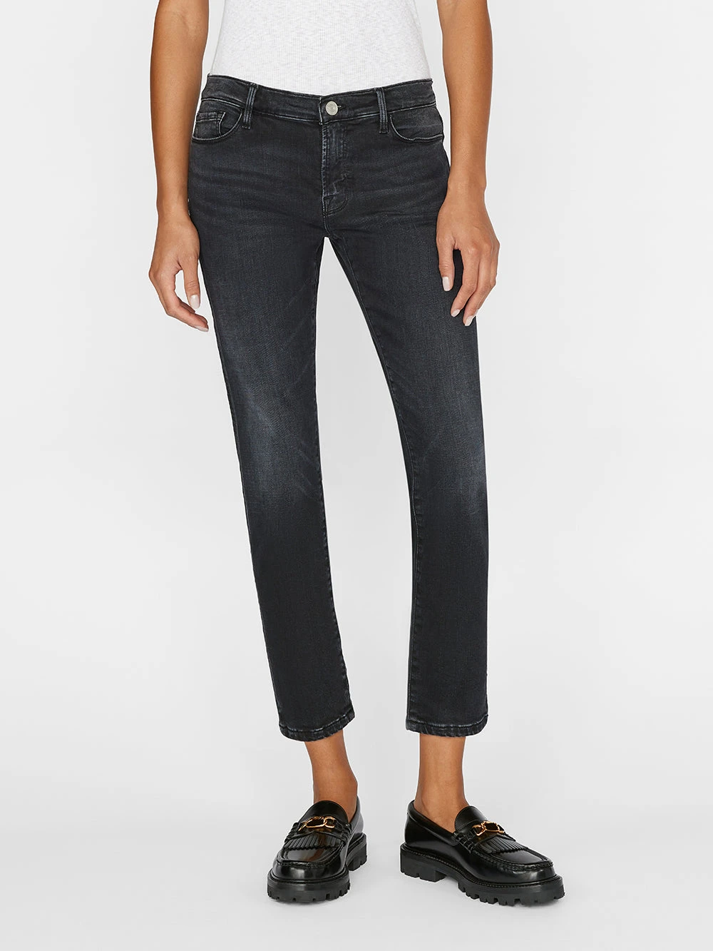 Please note: This is a Sale style. A $12 restocking fee applies for any return that includes Sale styles, deducted from the refund total. A FRAME classic, this mid-rise boyfriend jean is a slouchier—and more sophisticated—take on the classic boyfriend denim style. Featuring a slightly higher rise in the back, Le Garcon is meant to be worn low-slung at the hips. This washed black version is crafted from premium stretch denim, and finished with a clean cropped hem.