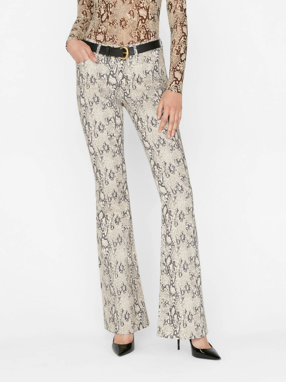 Please note: This is a Sale style. A $12 restocking fee applies for any return that includes Sale styles, deducted from the refund total. Form-fitting through the hips and thighs, with an easy flare that flatters all body types, this high-rise silhouette puts a fresh spin on retro style. This pair is done in the season’s most sought-after motif, a bespoke python print in neutral hues. Take this fit from your desk to the dance floor to a cozy corner booth.