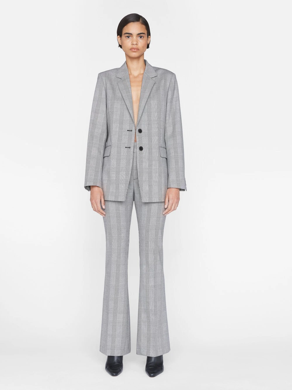 A FRAME signature silhouette with a form-fitting silhouette through the leg and generous flare from the knee. Designed with sophisticated trouser details at the waist, discrete slit pockets, and welt back pockets. Crafted a premium cotton wool blend for superb draping and emphasis on quality tailoring.