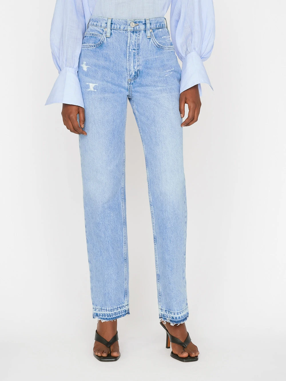 Please note: This is a Sale style. A $12 restocking fee applies for any return that includes Sale styles, deducted from the refund total. This love letter to ‘90s denim features a high-rise that nips in to accentuate the waist and give your backside a dreamy curved silhouette. This straight-leg fit is crafted from our cult-favorite rigid denim in a lightly-destroyed brilliant light-blue wash and finished with a released hem & on-trend 3″ inseam slit to add instant edge to every outfit.