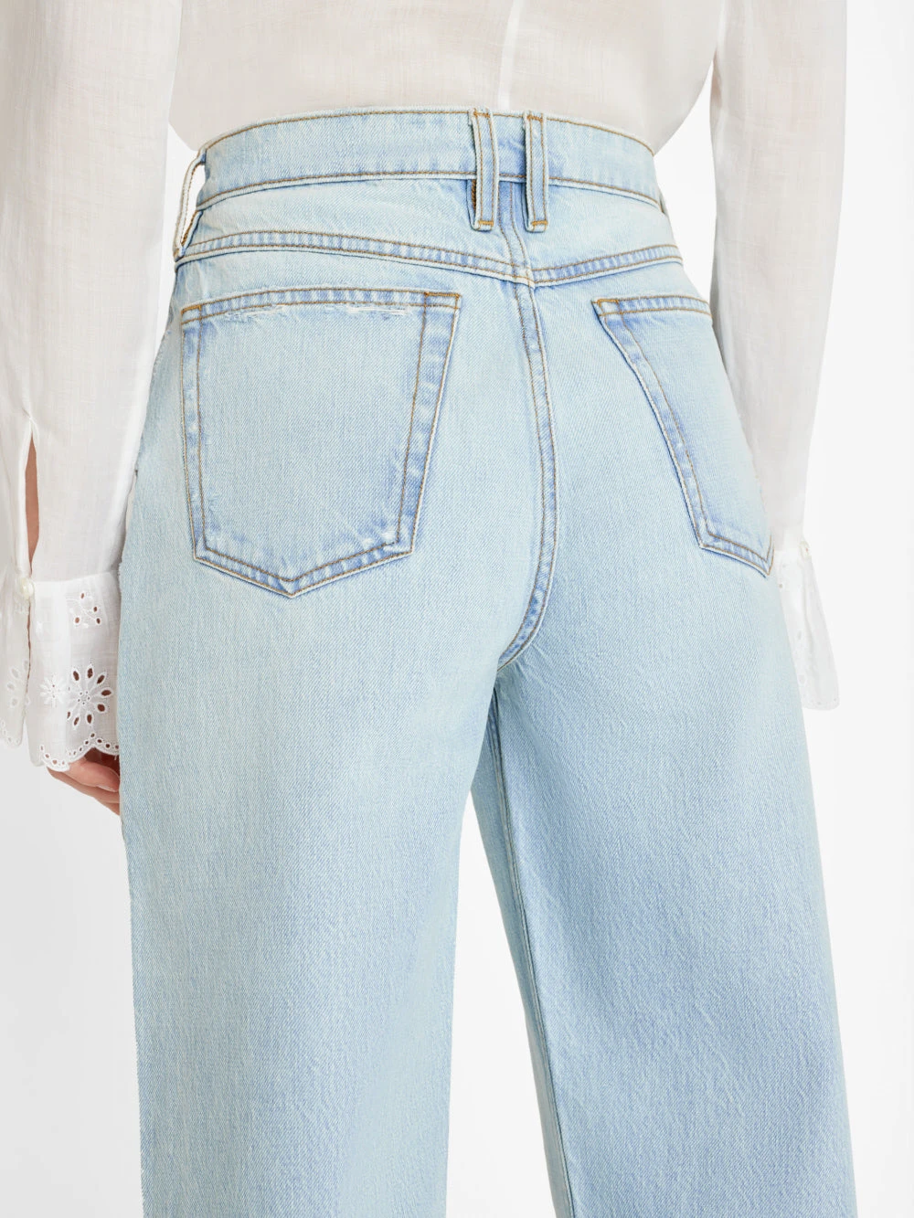 This love letter to ‘90s denim features a high-rise that nips in to accentuate the waist and give your backside a dreamy curved silhouette. Our beloved wide-leg fit now featuring a cropped inseam is crafted from light-blue rigid denim with a bright finish, and finished with a distressed raw hem.