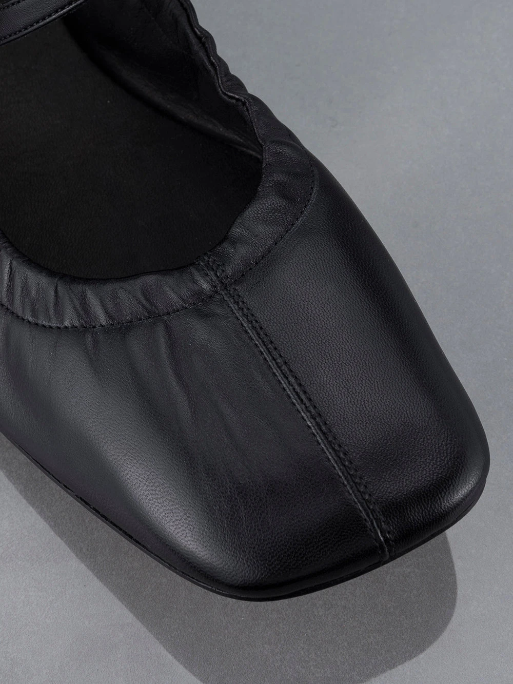Please note: This is a Sale style. A $12 restocking fee applies for any return that includes Sale styles, deducted from the refund total. The perfect modern Mary Jane, crafted from supple Italian leather in versatile Noir. With a sleek silhouette, slim strap, and subtly square toe, this pair features a memory foam insole with a rubber sole, plus an elasticized heel for all-day comfort.