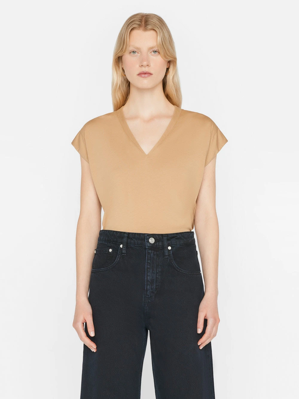 SKU: ZNJHB 7343962652848 Categories: Clothing & Accessories, Tanks & Tees, Women Tags: _badge:best-seller, _badge:july23_exclusions_sitewide, Clr-dscrp::LIGHT CAMEL, Collection::best sellers, Collection::getaway essentials, Collection::new women, Collection::tanks & tees, Collection::women, Collection::womenclothing, Color-code::LTCM, Delivery::F23_D1, Filter-category::tanks & tees, Filter-color::Beige, Filter-color::Brown, Filter-fabric::Cotton, Filter-size::L, Filter-size::M, Filter-size::S, Filter-size::XL, Filter-size::XS, Filter-sleeve::SHORT SLEEVE, Filter-style::NA, Fit:true, FLOW_INTL, FLOW_US, InventoryClassification::F23, Non-exclusion, Non-Sale, Season::F23, Season::P19, Style-code::LWTS0826, Styled::extra-long-barrel-film-noir, Styled::le-casimere-thong-sandal-noir, Styled::le-high-straight-whitwell, Styled::long-barrel-film-noir, Swatch:Le Mid Rise V Neck Tee, Topsize