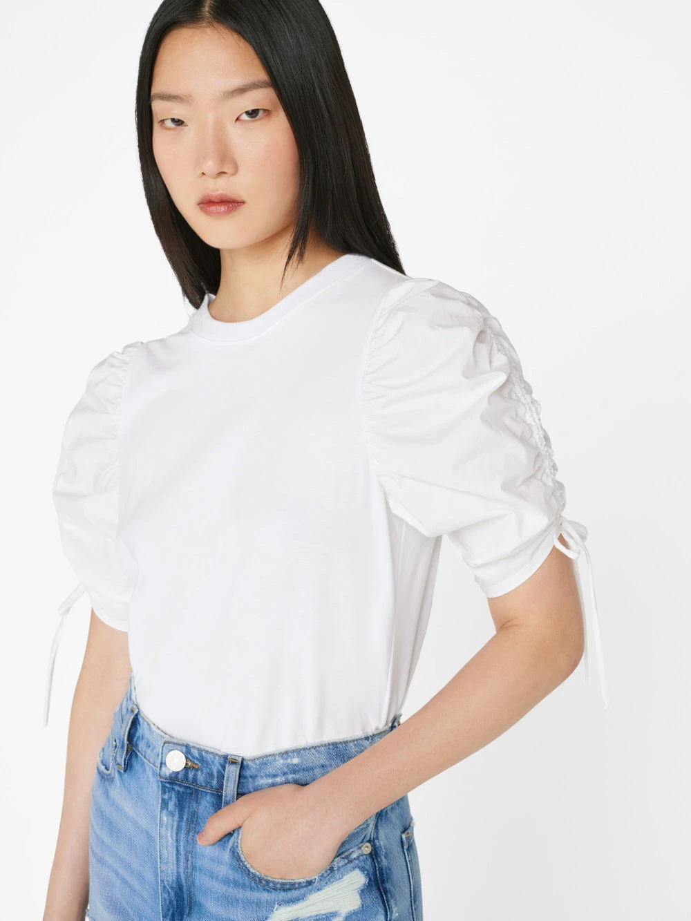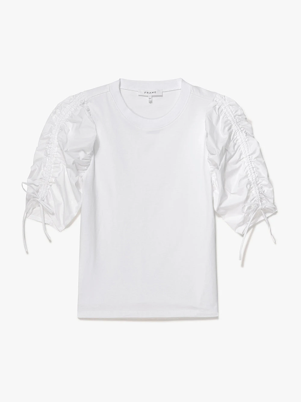 Effortlessly feminine, this organic cotton tee features a slim fit and elbow-grazing poplin ruched sleeves with a tie that can be done up in a bow for a playful finish.