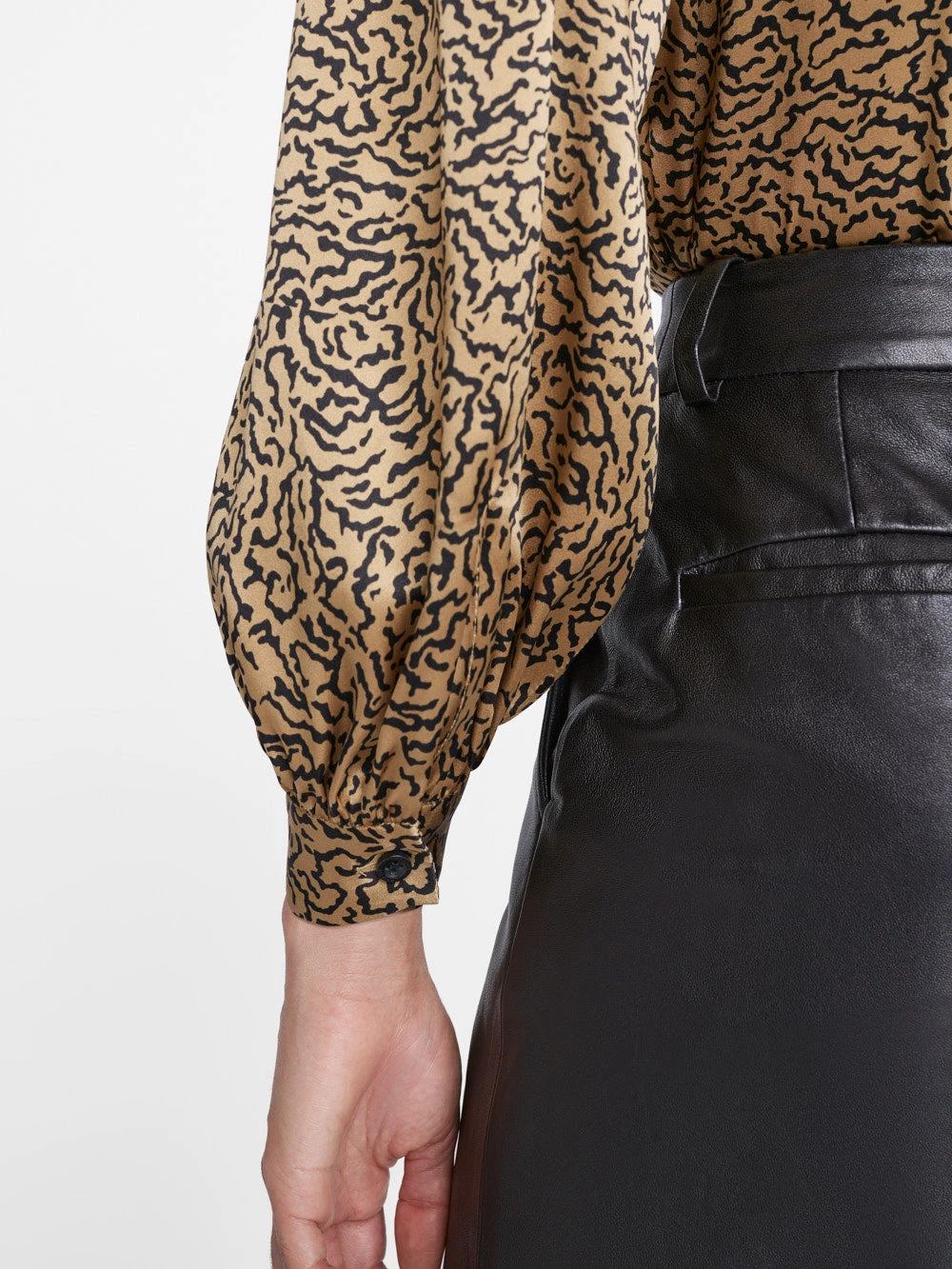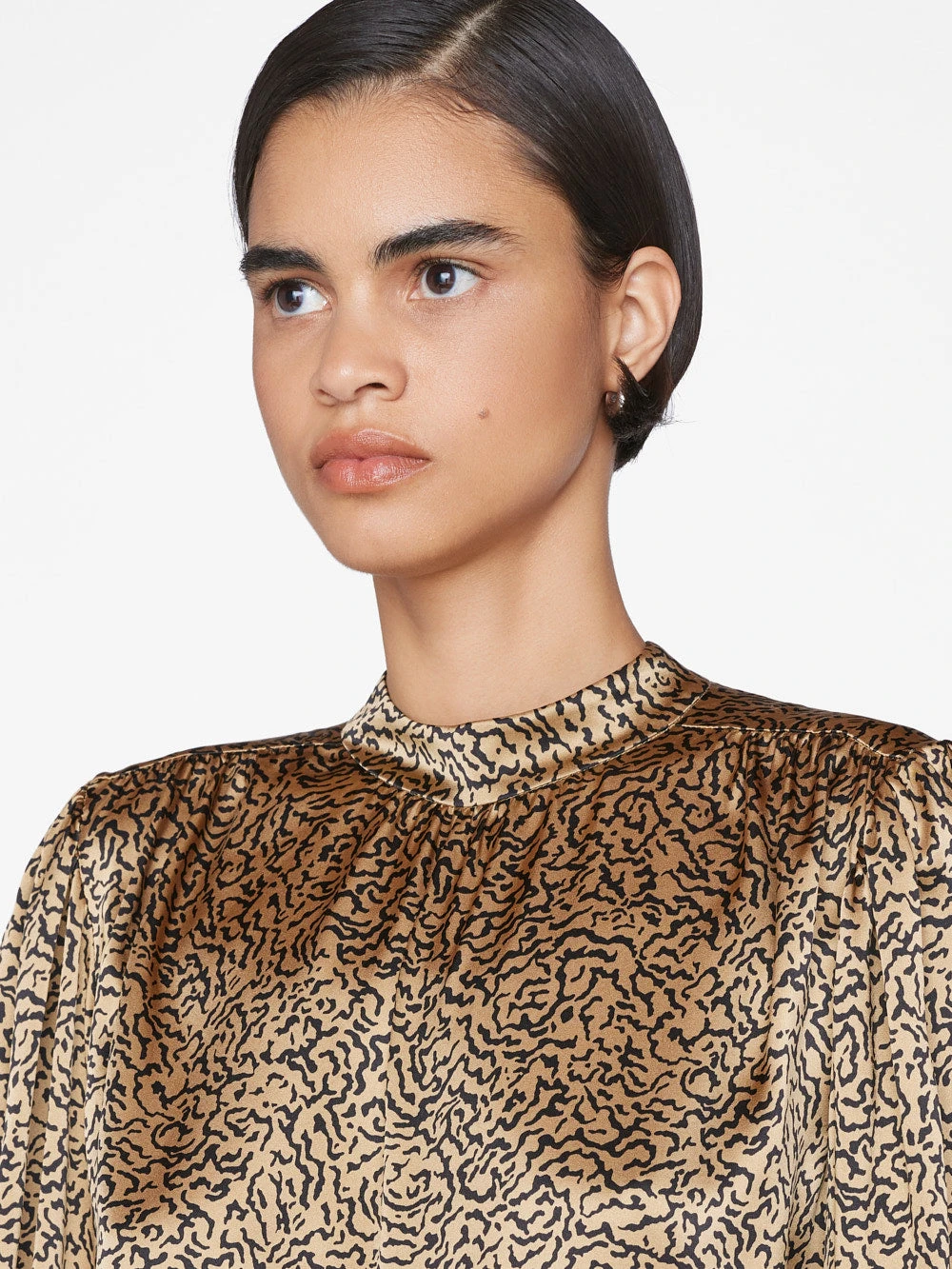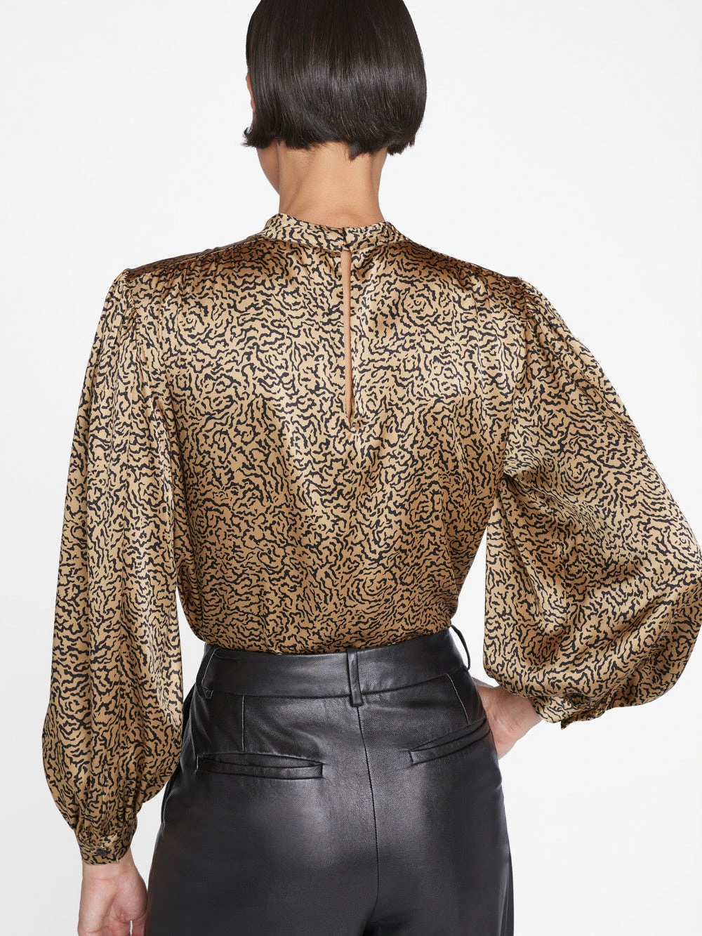 A smart mock neck blouse that exudes sophistication and grace. Complete with shirred shoulder detailing, delicate pleats at the chest, keyhole button closure at the back, and an effortless billow at the cuffed long sleeves. This top features a new abstract animal print to give an elevated update to your traditional prints. Crafted from an ultra-luxurious 100% silk with a subtle gloss.