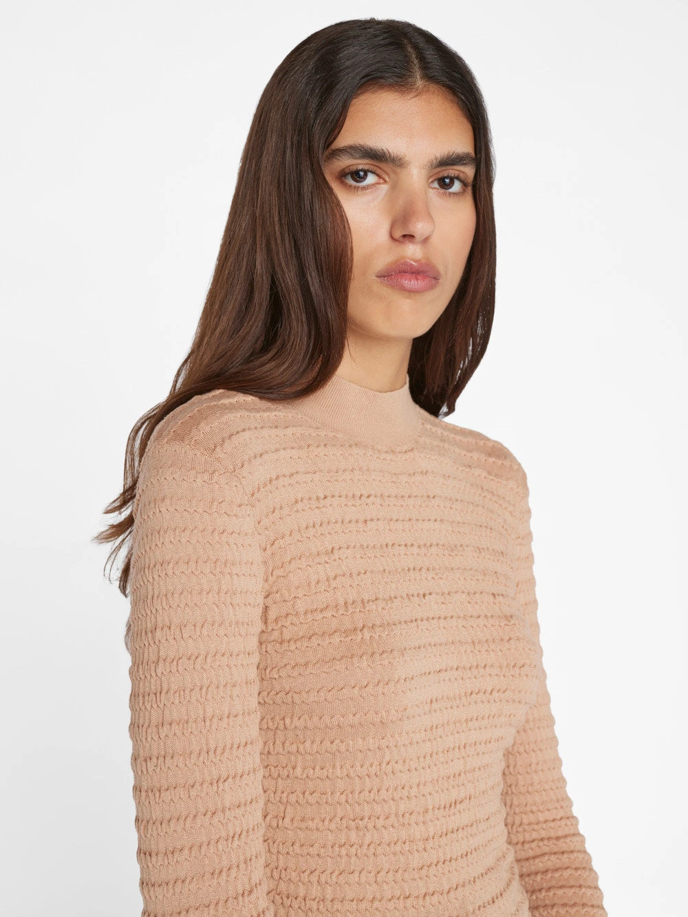 Long sleeve mock neck sweater in a body-hugging fit. Designed in a ’90s-reminiscent smocked knit made with a silk cotton blend.