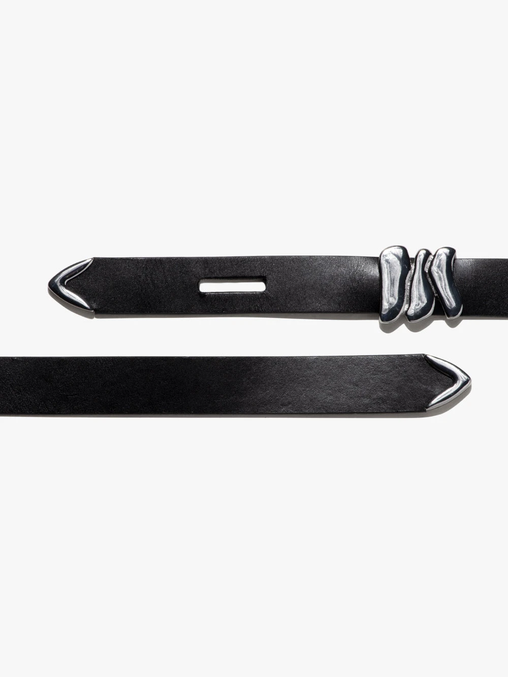 A western belt with a modern twist. Finished in chrome hardware with eye-catching organic contours, this women’s essential offers an elongated belt for knotted closure. Designed in 100% leather with quality craftsmanship.