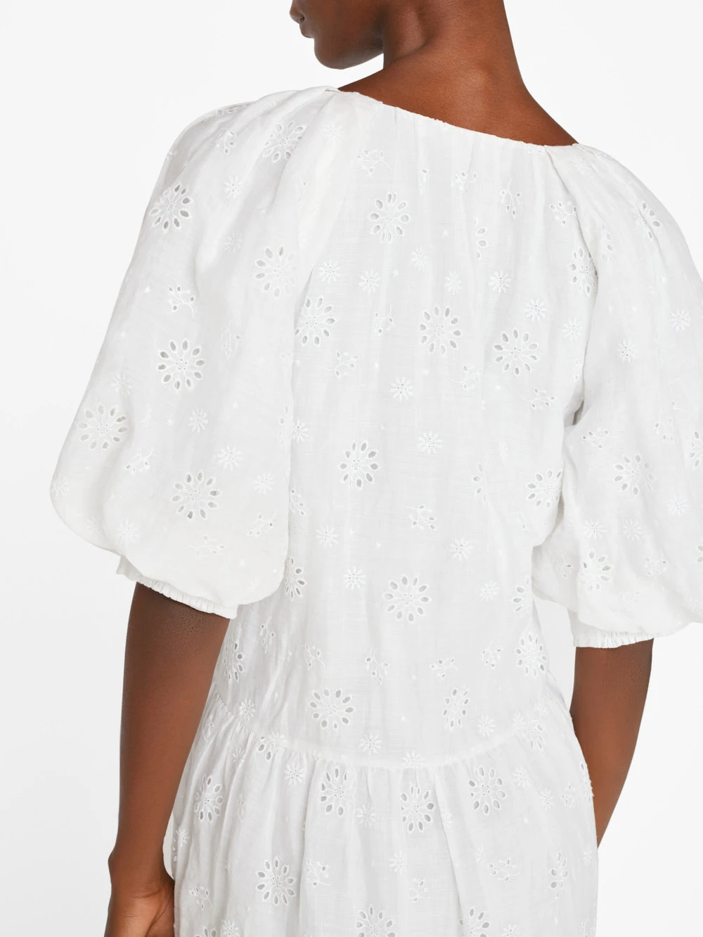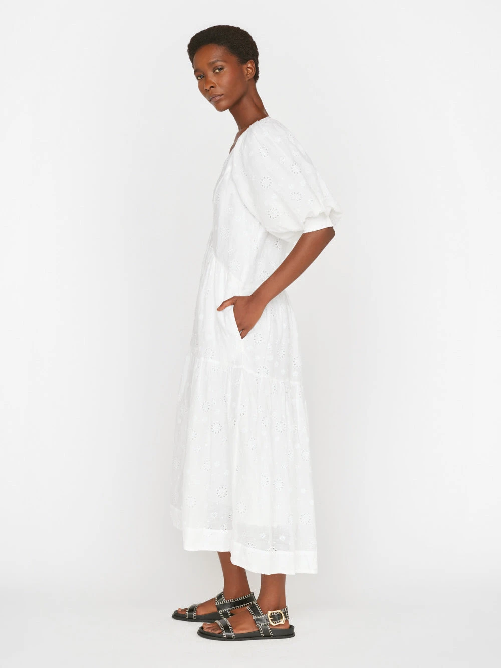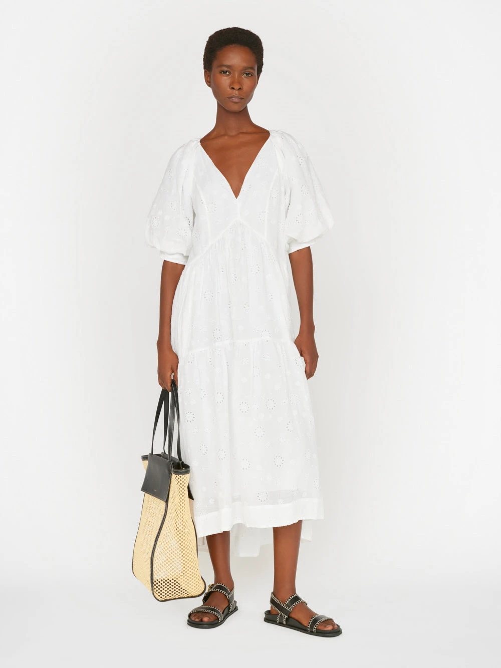 Please note: This is a Sale style. A $12 restocking fee applies for any return that includes Sale styles, deducted from the refund total. Done in Blanc eyelet ramie, this v-neck dress is a breath of fresh air for your daily uniform. With sculptural puff sleeves and an empire waist that descends into an asymmetrical skirt with tiered panels, this piece has a flattering fit that feels romantic and fun to wear. She’s pretty, she’s practical, she even has pockets.